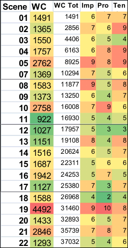- Promise Count – Promises are new pieces of story information not explained in the scene. This is high in the beginning of the book and tails off towards the end. I do have a “promises kept” count column but I haven’t started filling it out yet.